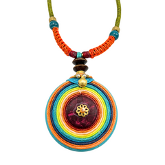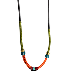 Collar con cordón de ecocuero y detalles en hilo encerado, colgante de piedra turquesa con hilos de colores.