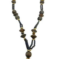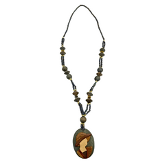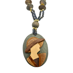 Collar de Madera y colgante ovalado con un diseño de mujer con sombrero tallado en madera.